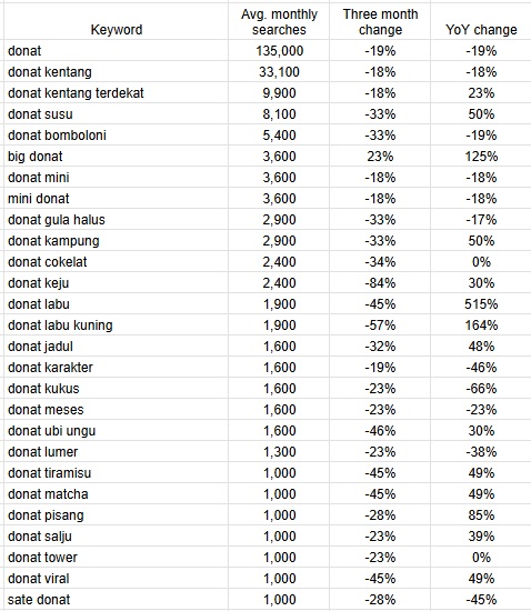Perlu diketahui, data ini adalah berdasar pencarian keyword “donat”, jika menggunakan keyword “donut” hasilnya akan berbeda lagi, di mana orang Indonesia lebih banyak yang mencari “donat” daripada “donut”.
