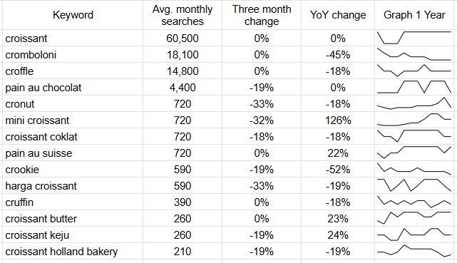 Data pencarian bisa dipakai sebagai kompas minat, terutama untuk melihat format croissant apa yang sedang dicari orang.
