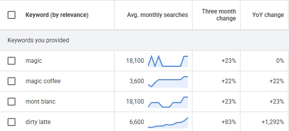 Dari sisi data, Mont Blanc dan magic terlihat sudah memiliki volume pencarian yang besar, sementara dirty latte menonjol di pertumbuhan yang sangat cepat. Bagi coffee shop, ini bisa diterjemahkan sebagai berikut: Mont Blanc dan magic cocok dijadikan menu yang menambah kedalaman lini kopi spesialti, sedangkan dirty latte menjadi pintu masuk tren yang sedang naik dan sangat layak diuji.