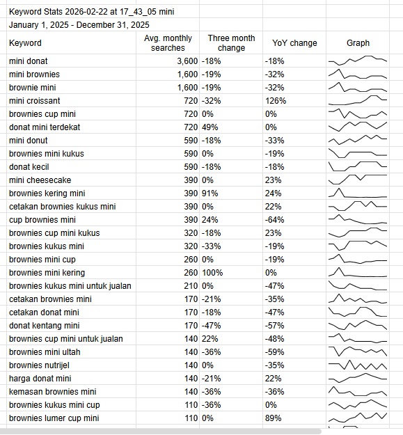 Mini dessert dan mini pastry dengan porsi kecil pelan-pelan menjadi kategori yang serius di kafe dan bakery Indonesia. Data pencarian seperti “mini donat”, “mini brownies”, “brownie mini”, dan “mini croissant” menunjukkan volume yang stabil, dengan ribuan pencarian per bulan sepanjang 2025. Banyak orang mencari versi kecil dari produk yang sudah dikenal, bukan sekadar dessert baru. Bagi pengunjung, porsi kecil terasa lebih terjangkau dan lebih “aman” untuk dicoba. Bagi pemilik kafe, format mini membuka banyak ruang untuk bermain rasa, plating, dan bundling dengan kopi.