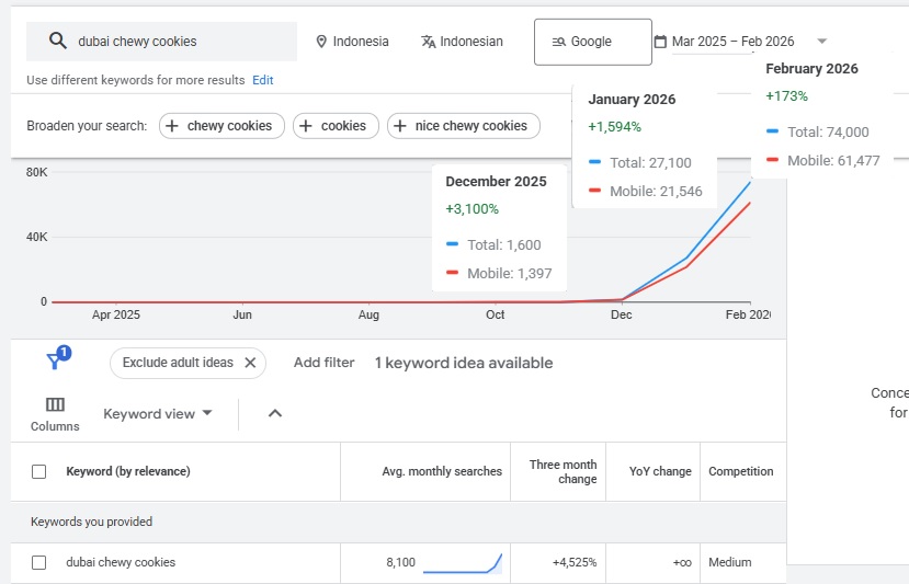 Kue dubai chewy cookies saat ini sedang menjadi pembicaraan hangat di kalangan pecinta makanan manis di seluruh nusantara. Berdasarkan data statistik pencarian dari bulan Maret 2025 hingga Februari 2026, volume pencarian kata kunci ini di Indonesia mengalami lonjakan yang sangat tajam hingga 4525 persen. Angka pencarian yang awalnya berada di titik nol pada awal tahun 2025 merangkak naik perlahan dan akhirnya menembus 74000 pencarian pada bulan Februari 2026. Lonjakan ini menunjukkan adanya minat pasar yang sangat besar terhadap kudapan bertekstur kenyal dengan cita rasa gaya Timur Tengah. Anda yang memiliki bisnis kafe tentu dapat melihat fenomena ini sebagai peluang yang sangat menguntungkan untuk menarik perhatian generasi muda. Peningkatan tajam ini juga menandakan bahwa masyarakat kita sangat terbuka terhadap pengaruh kuliner internasional yang disajikan dengan cara baru.